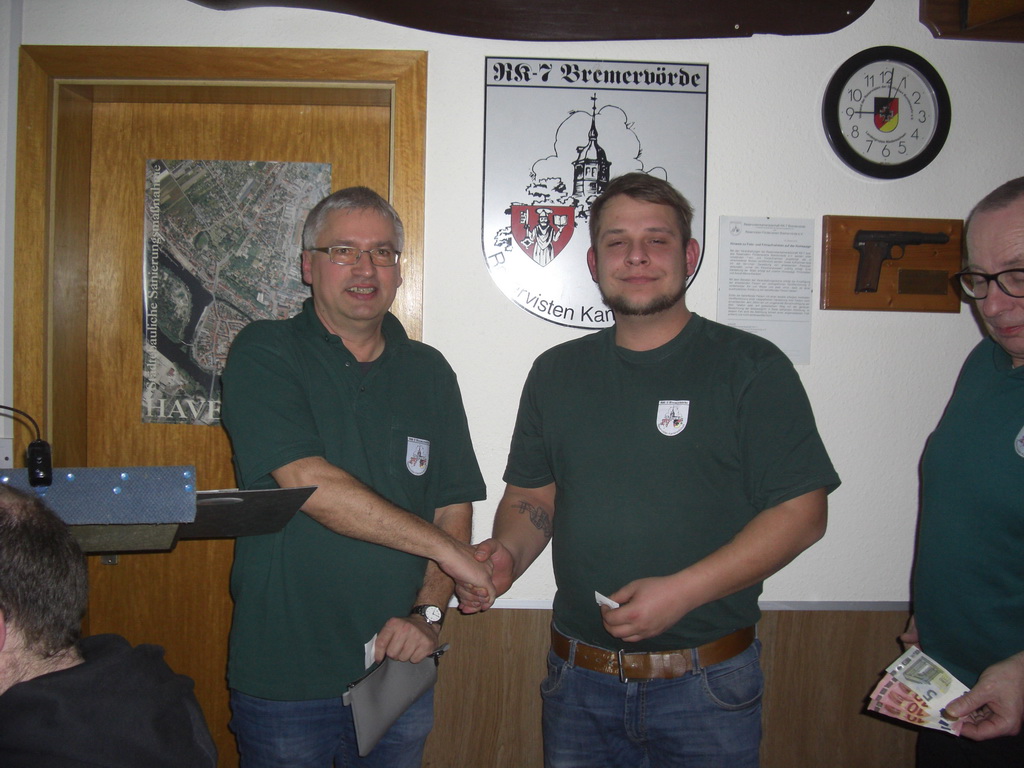 | Enno Rugen hat vom Schießwart, Stefan Raeker, für seine regelmäßige und erfolgreiche Teilnahme am KK-Übungsschießen im letzten Jahr, ein Gutschein für zwei Personen im Bremervörder Restaurant Dubrovnik bekommen. |